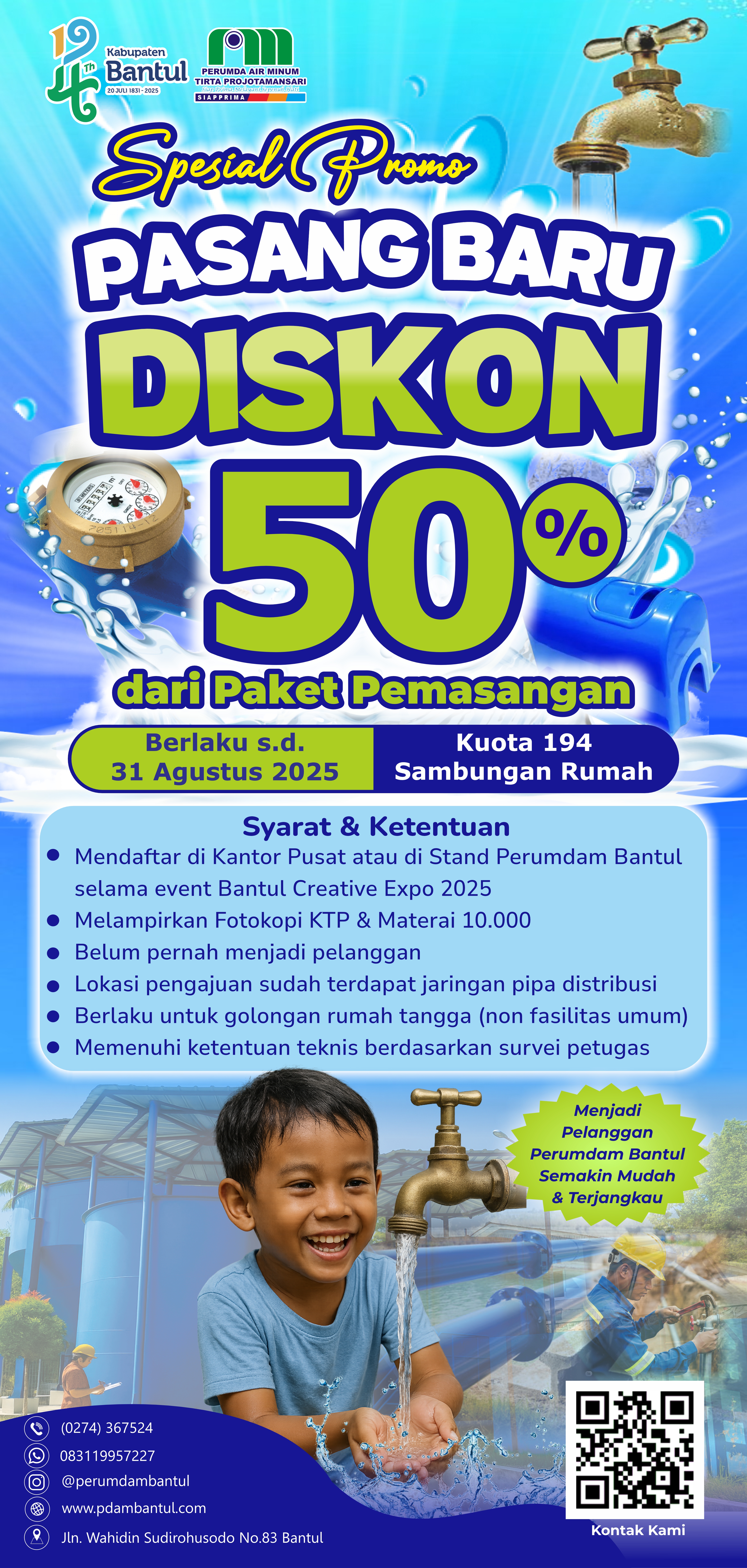 Pada kesempatan ini, Perumdam Bantul hadir dengan berbagai program dan kegiatan menarik. Salah satu program unggulan yang ditawarkan adalah diskon 50% untuk pemasangan baru sambungan rumah, yang berlaku khusus untuk 194 pelanggan. Pengunjung cukup mengisi formulir pendaftaran di stand Perumdam Bantul untuk mengikuti program ini.